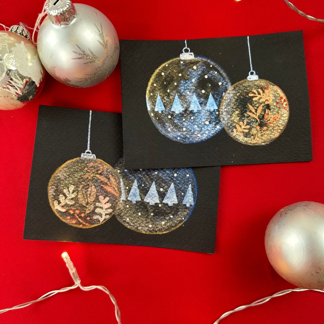 Glitrende julekugler skal ud fra dagens gaver, som var sort akvarelpostkort og 2 glimmerakvareller fra Van Gogh.