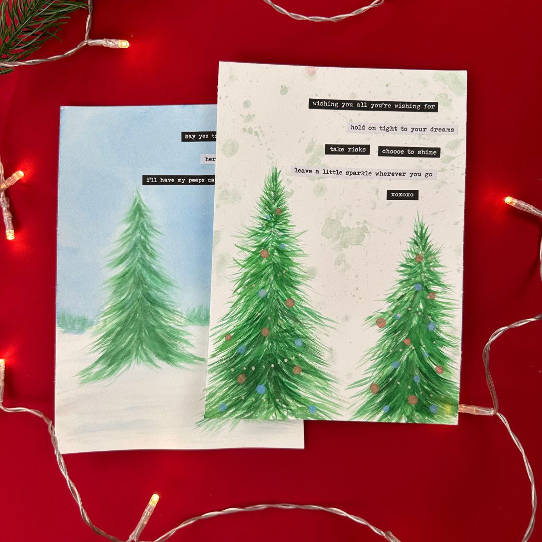 Smukke juletræer krydret med personlige citater fra dagens pakke med fire siders citatlistermærker og den fede fanepensel.
