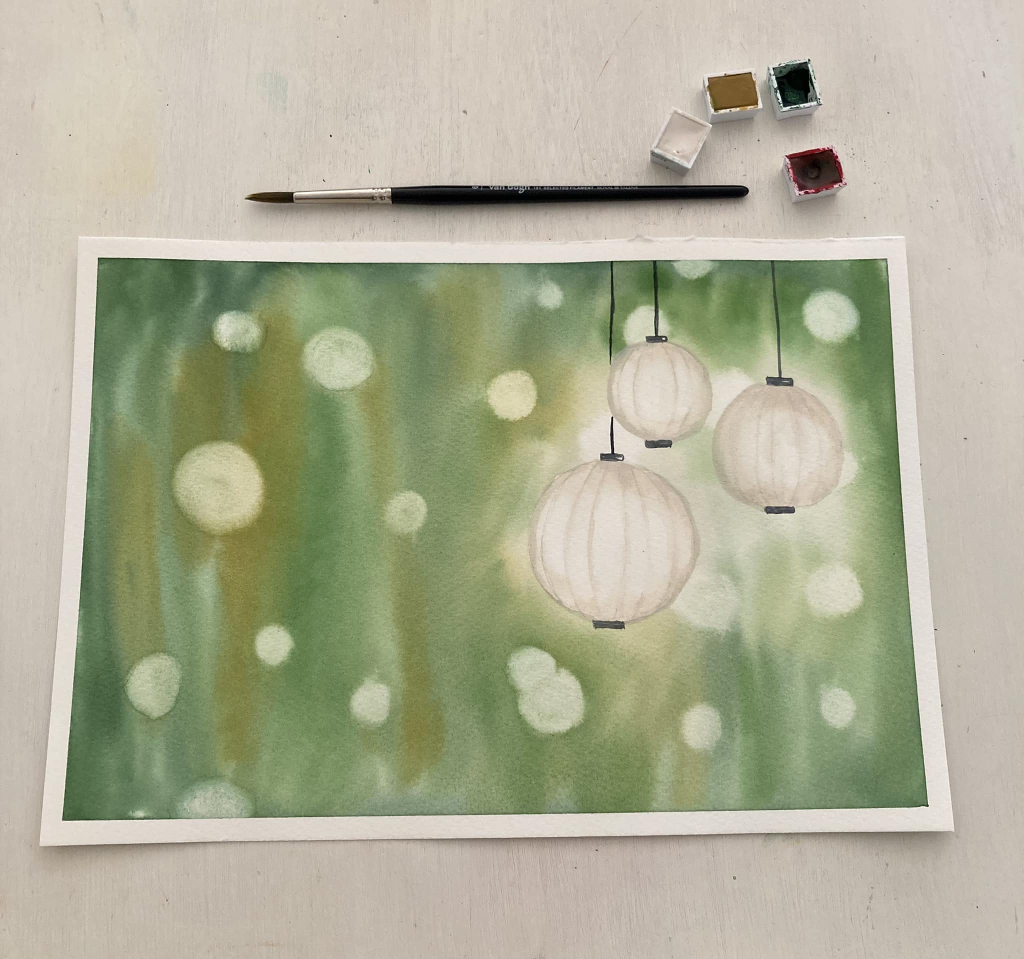 Tænd for lanterne, når solen går ned og lad bokeh teknikken skinne frem på dit papir. Med den magiske svamp kan du løfte malingen og komme i mål med den skønne sommeraften stemning i haven.