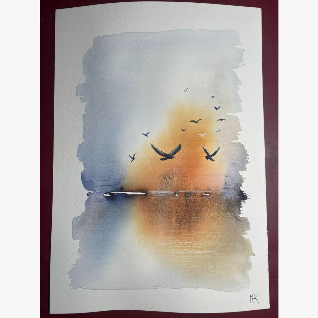 Et roligt landskab, hvor fuglene letter mod den stemningsfulde himmel. Her arbejder du med bløde og ensartet farveovergange, der skabes af en helt speciel teknik. Med små detaljer og skæret i vandet, samles dit maleri i en skøn atmosfære.