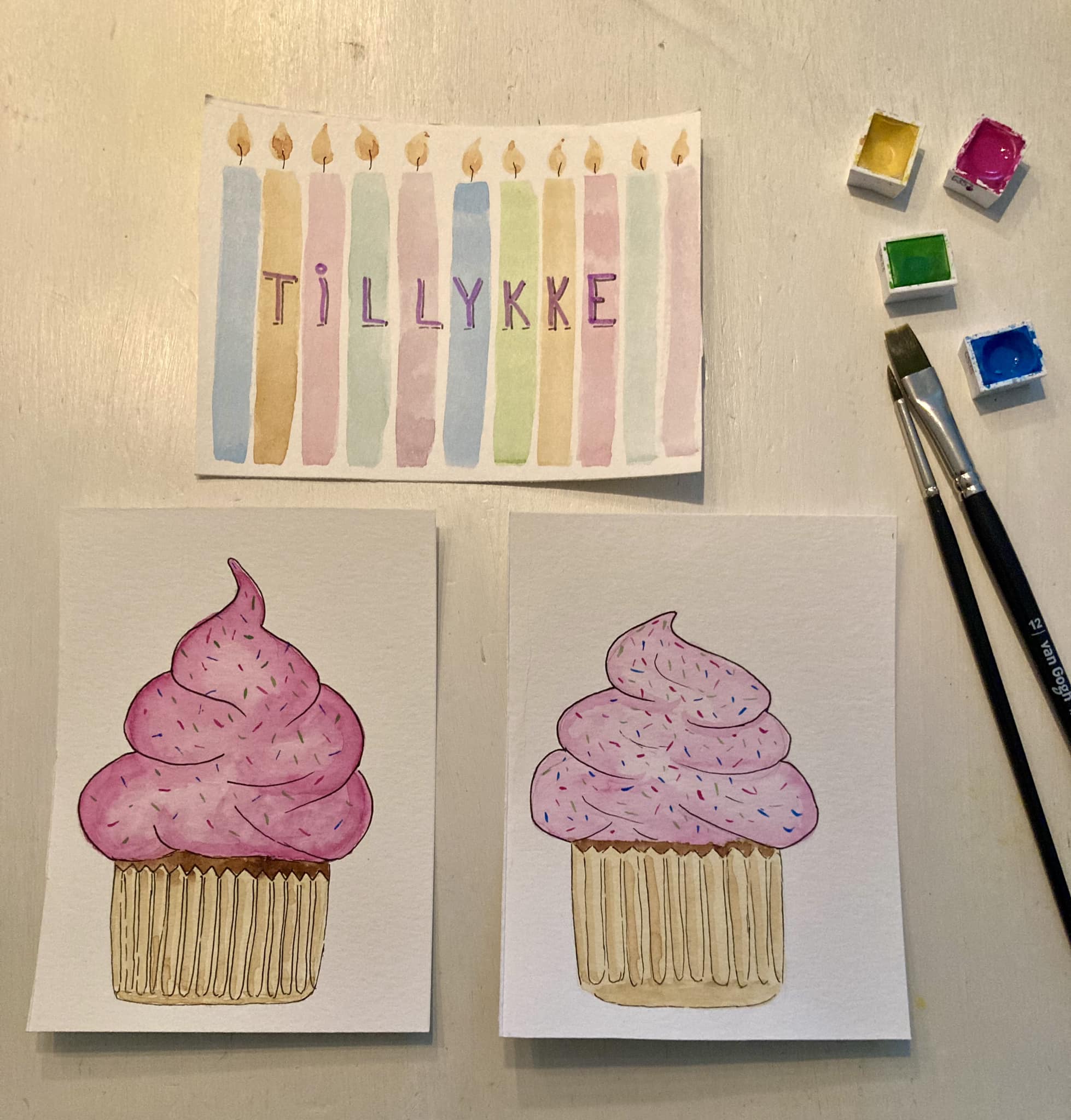 Lær at bygge dit maleri op med forskellige toner af din farve. Kortet får det fineste grafiske udtryk, når du til sidst tegner din cupcake op med din fineliner.