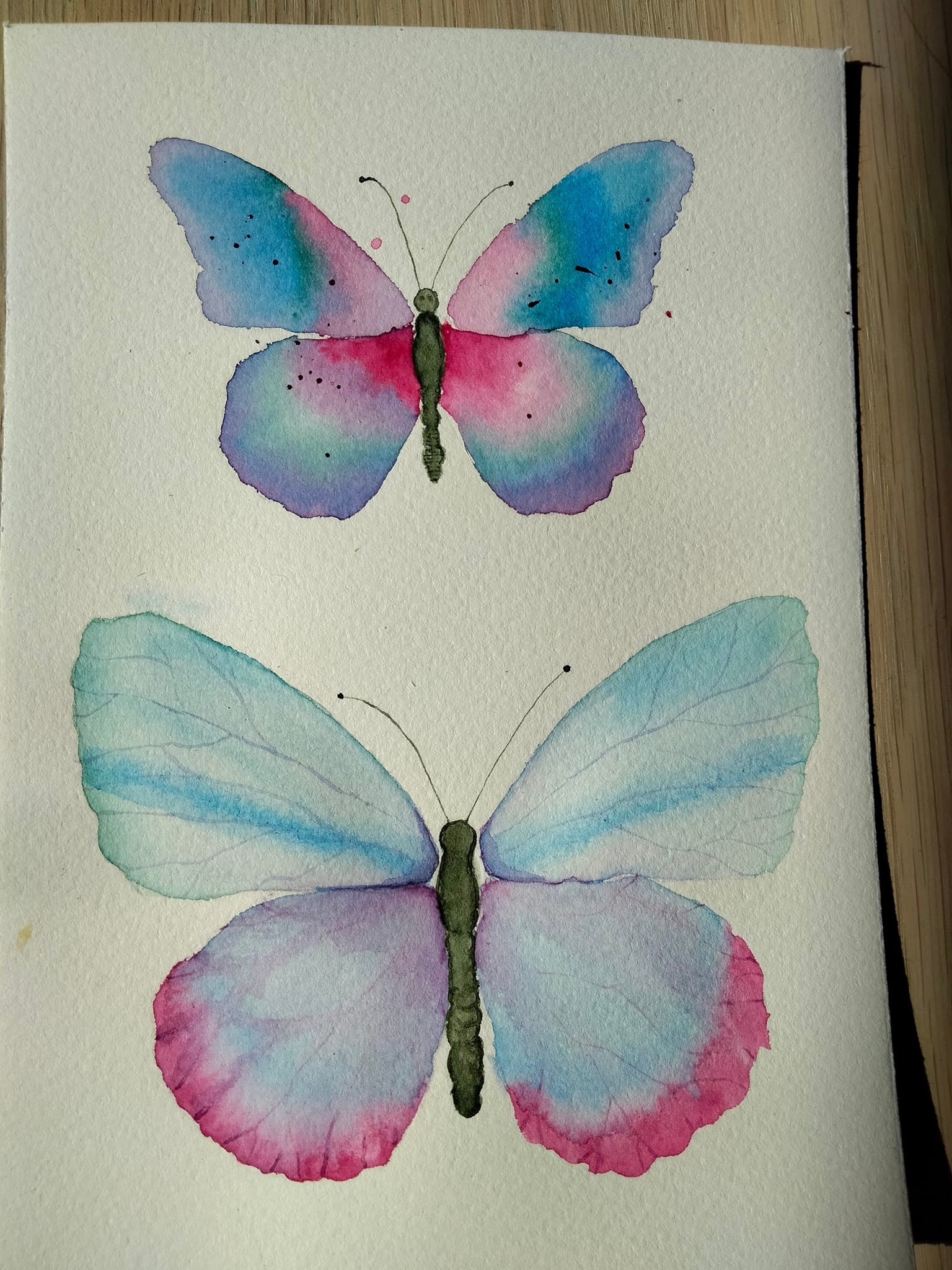 Tre smukke sommerfugle, der hver især er malet med våd-på-våd teknikken. Det er et hyggeligt projekt, hvor du kan nyde at se, hvordan malingen spreder sig på dit papir.