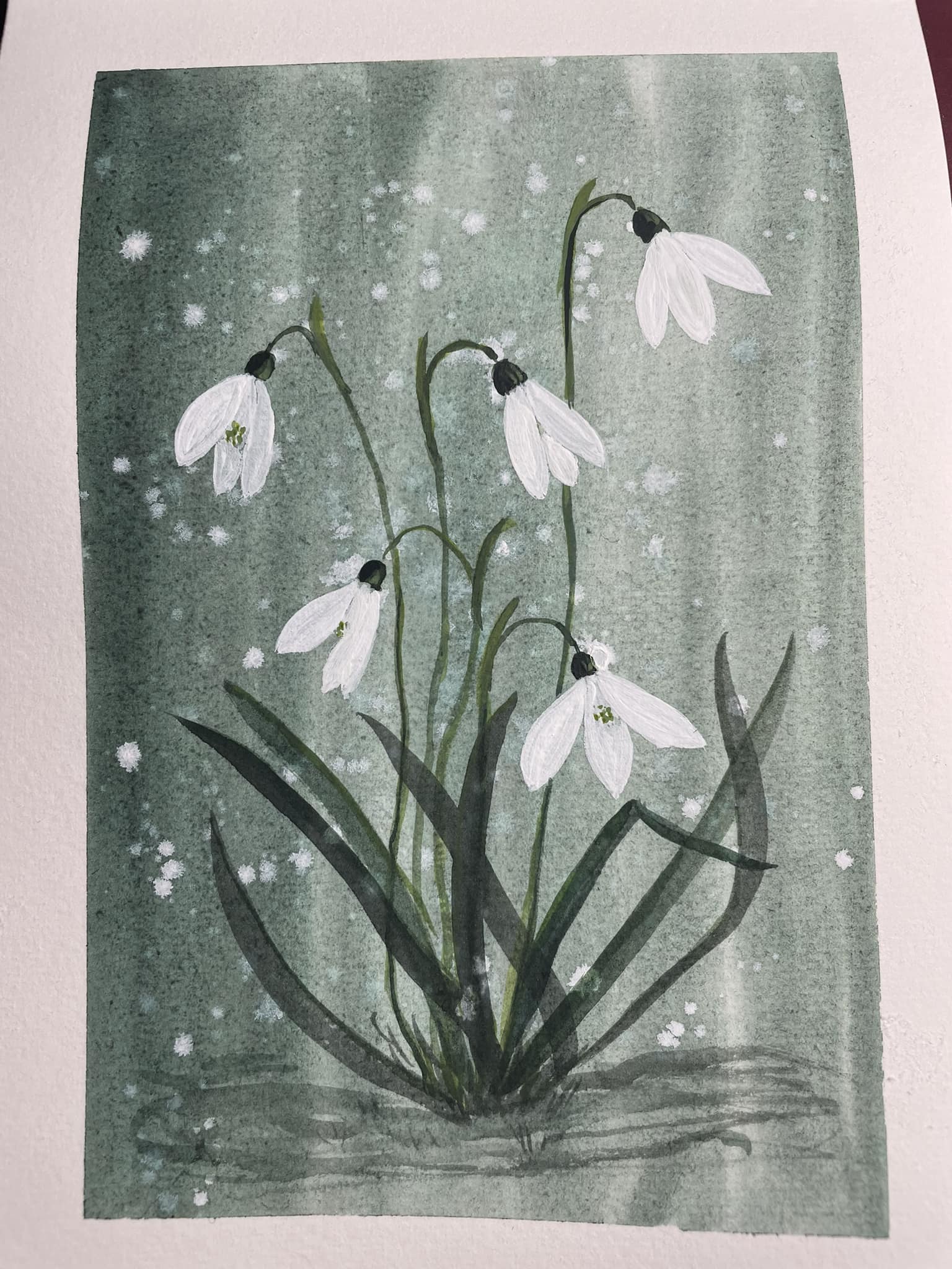 Kom godt i gang med Den fredfyldte boks, når vi maler de yndige vintergækker, der lidt endnu er i dvale. Vi bruger månedens ekstra produkt, hvid gouache, på en virkelig sjov måde, hvor den både bliver en del af baggrunden og som hvide blomster i forgrunden.