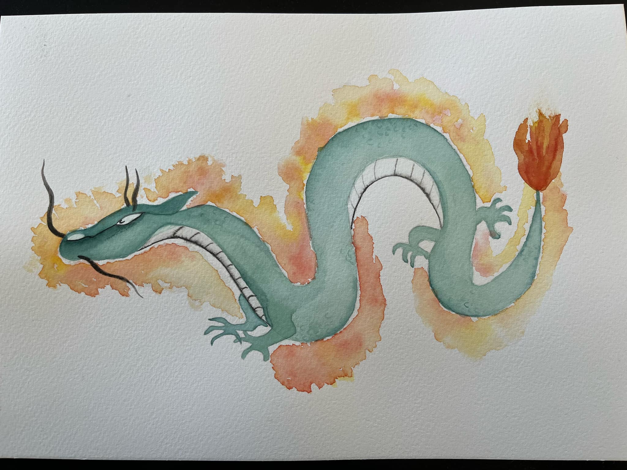 Dragen Tatsu er både lærerig og legesyg! Ved at duppe både akvarelmaling og blæk ind på rent vand i dit maleri, lader vi materialerne arbejde selv og skabe et naturligt og sjovt udtryk!