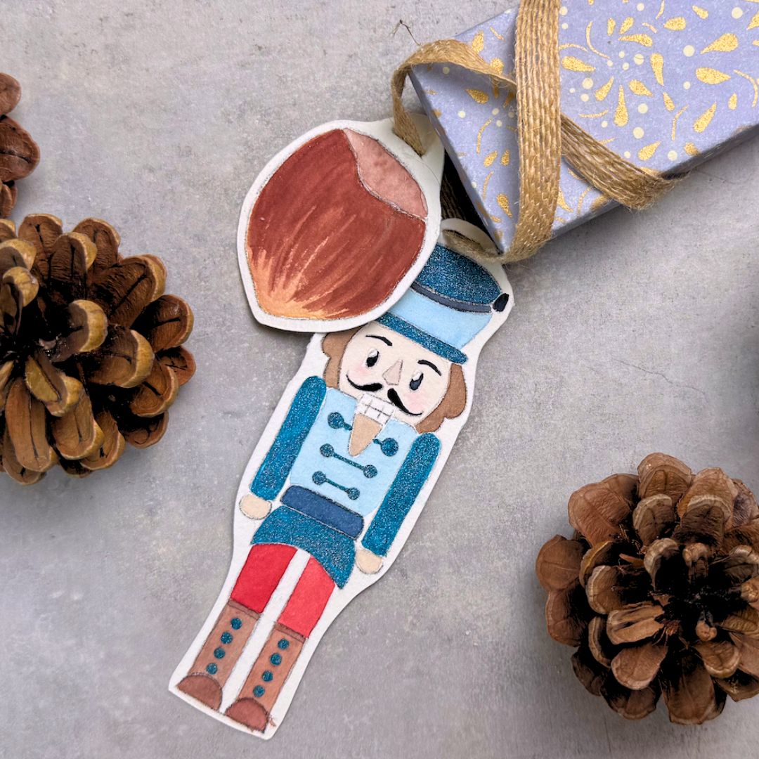 Slut juleboksen af med et eventyrligt skåret kort, hvor nøddeknækkeren kommer til live med både smukke farver og glimmer. Og hvad er han uden en stor nød at knække?