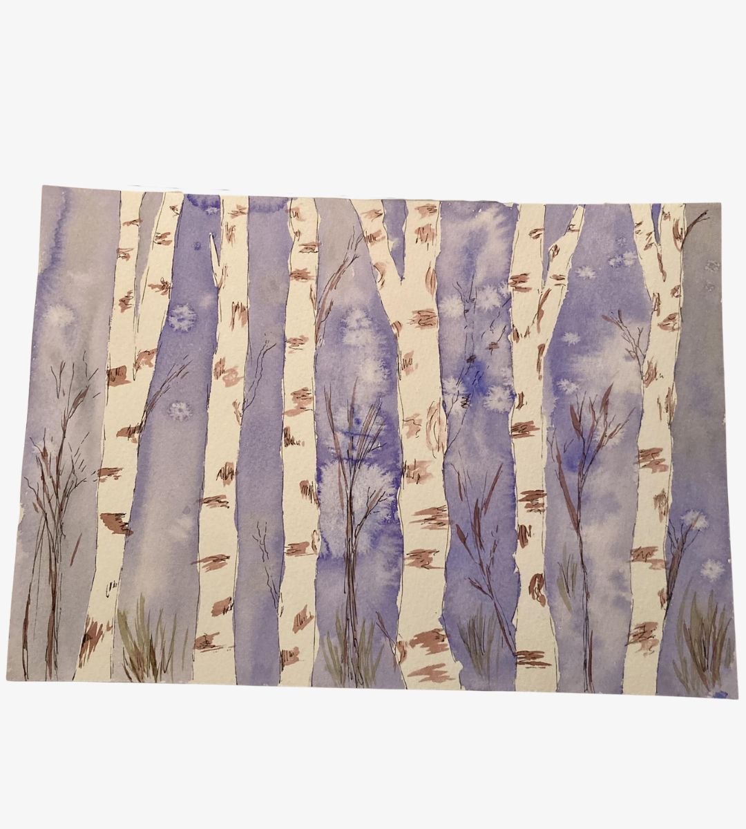 Lad vinterlyset danse mellem de slanke birkestammer og brug washi tapen til at skabe de vilkårlige og tilfældige linjer, der både føles grafisk og eventyrligt. Og så til alle detaljerne, som skabes af den sorte gelly roller, der både kan bruges ovenpå og under akvarelmaling!