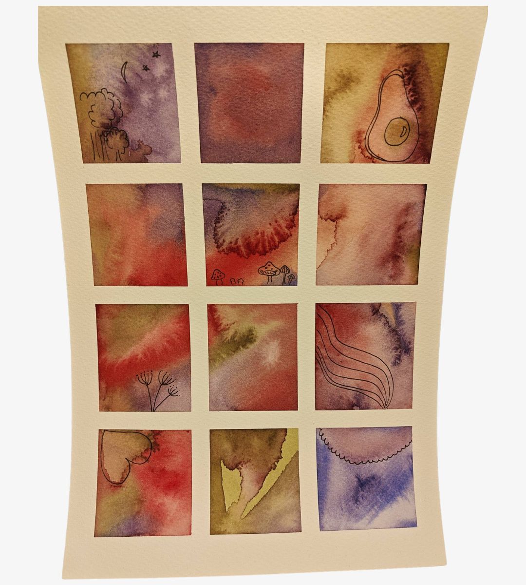 Tag med ind i et lille univers af farver, der folder sig ud mellem linjerne. Vi leger med akvarellens uforudsigelige bevægelser: pigmenter, der blander sig i både bløde og hårde overgange, samt små finurlige møder - og fine streger, der til sidst binder det hele sammen.